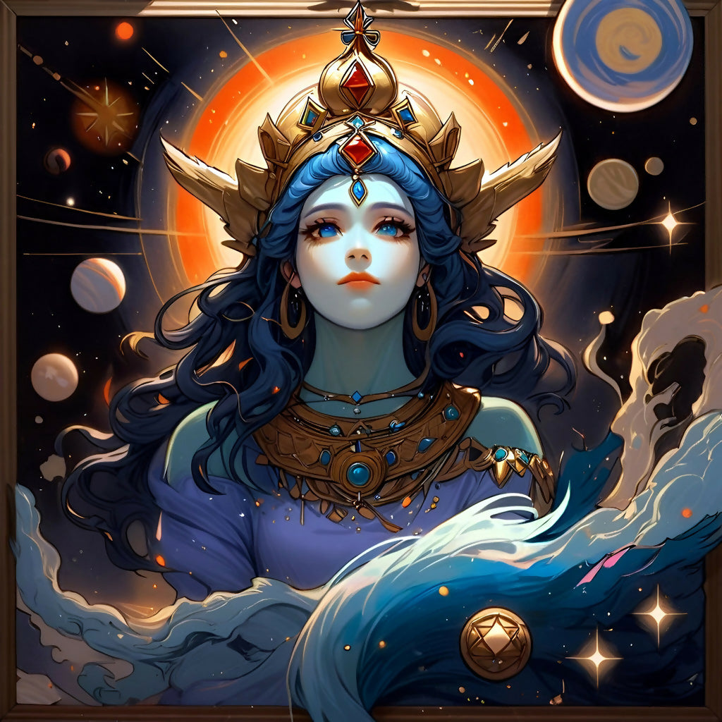 Step into the astral domain of Celestial Sovereign, a surreal AI-generated masterpiece that portrays a divine cosmic queen reigning over the universe. Her flowing sapphire hair, radiant golden crown, and orbiting celestial bodies evoke themes of mysticism, astrology, and divine order. Surrounded by swirling galactic clouds and sacred geometry, she symbolizes the balance between chaos and creation.In a forgotten myth whispered across galaxies, the Celestial Sovereign was born from the collision of stars—an eternal guardian of planetary harmony. Her crown holds the wisdom of nebulae, and her gaze commands the tides of time. This artwork captures the moment she awakens to realign the cosmos, reminding us that even in chaos, there is divine design. Perfect for collectors of fantasy, spiritual, and surreal art, this piece bridges mythology and astronomy in a visually stunning narrative.
