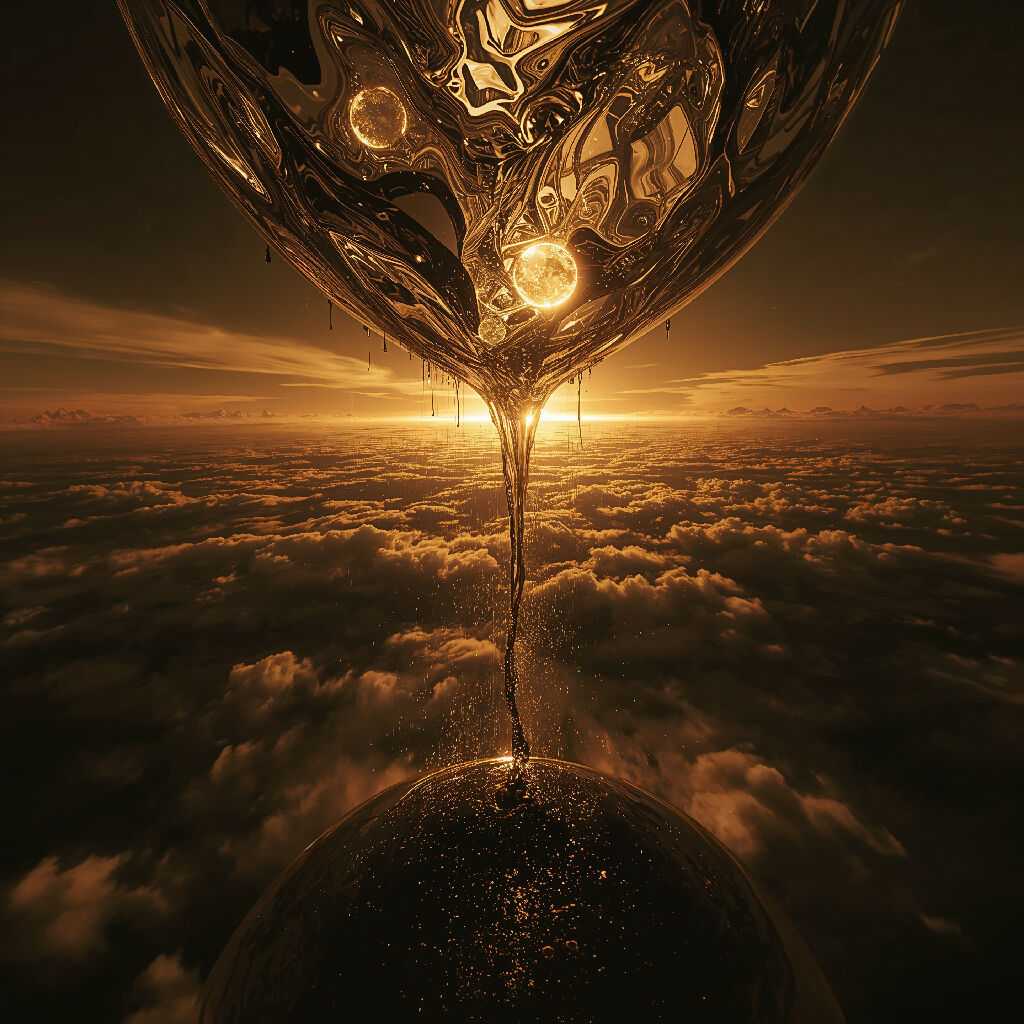 An inverted landscape presents a mirror world where golden sky meets earthbound sphere through streams of liquid light. The upper realm swirls with baroque complexities containing celestial bodies, while below, clouds stretch infinitely toward the horizon. A central column of luminous matter connects these opposing realms, suggesting the flow of consciousness between material and spiritual dimensions. The warm palette of amber and gold creates an atmosphere of divine presence and transformation. This vertical axis represents the eternal exchange between heaven and earth, with flowing energy serving as both bridge and boundary between cosmic order and earthly existence.