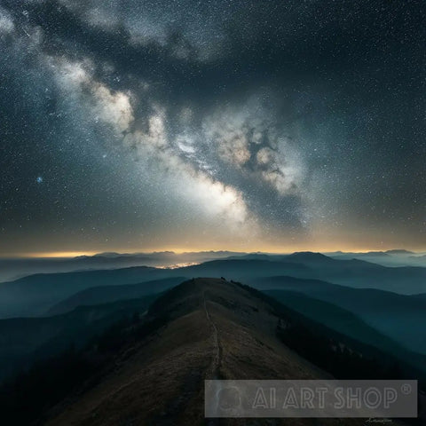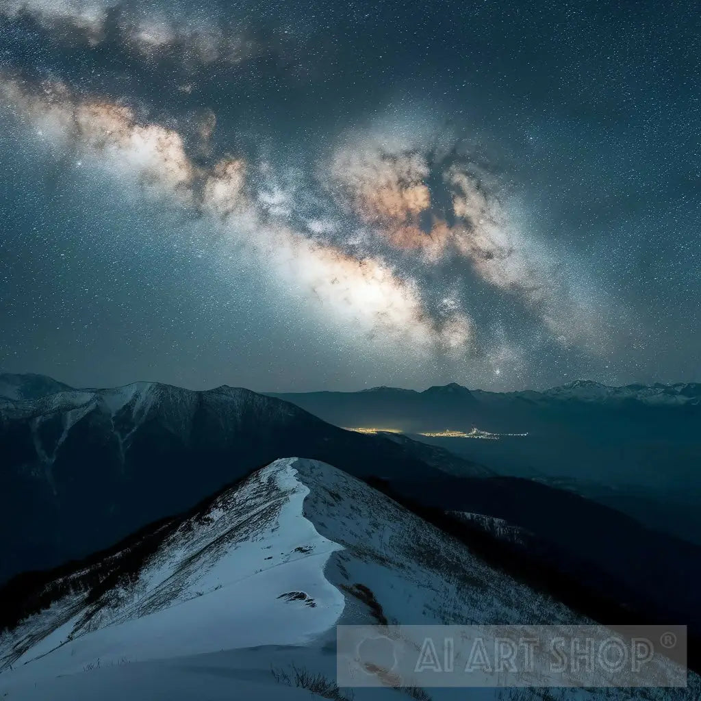 This image captures the awe-inspiring power and beauty of the universe. The vastness of the Milky Way galaxy contrasted with the solitary peak and the distant town symbolizes humanity's place within the cosmos.