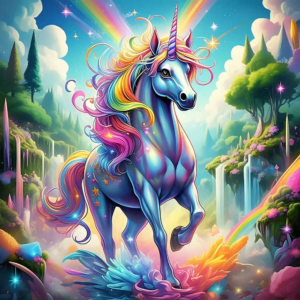 Step into a world where magic pulses through every color. Celestial Unicorn: Guardian of the Rainbow Realm captures the moment a mythical unicorn rises from a radiant pool of light, surrounded by cascading waterfalls and floating clouds. Its iridescent blue body and rainbow mane shimmer with cosmic energy, as if summoned by the dreams of stargazers and believers. Legend says this unicorn guards the bridge between imagination and reality—appearing only when the skies align with hope. This surreal AI artwork is a tribute to wonder, fantasy, and the power of belief. Perfect for dreamers, fantasy lovers, and collectors seeking vibrant, story-rich visuals.