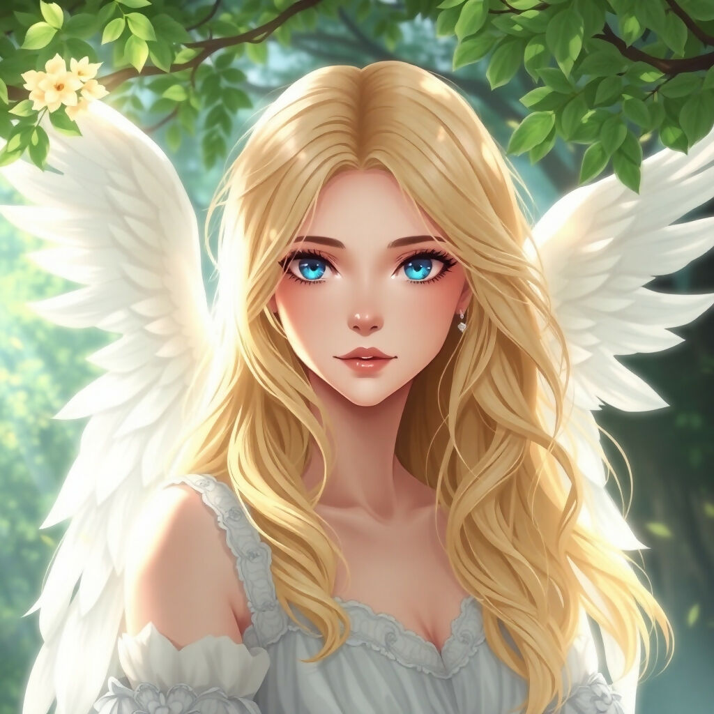 A radiant angel stands among sunlit trees, her white feathered wings glowing softly in the warm forest light. Golden hair flows gently around her as she gazes forward with calm, ethereal presence, surrounded by lush greenery and drifting sunlight. This artwork blends fantasy and serenity, capturing a moment of quiet grace in a peaceful woodland sanctuary.