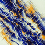 The image features an intricate abstract pattern of interconnected cells or bubbles in shades of blue, orange, white, and brown. The honeycomb-like structure creates an organic feel, reminiscent of coral reefs or microscopic organisms.