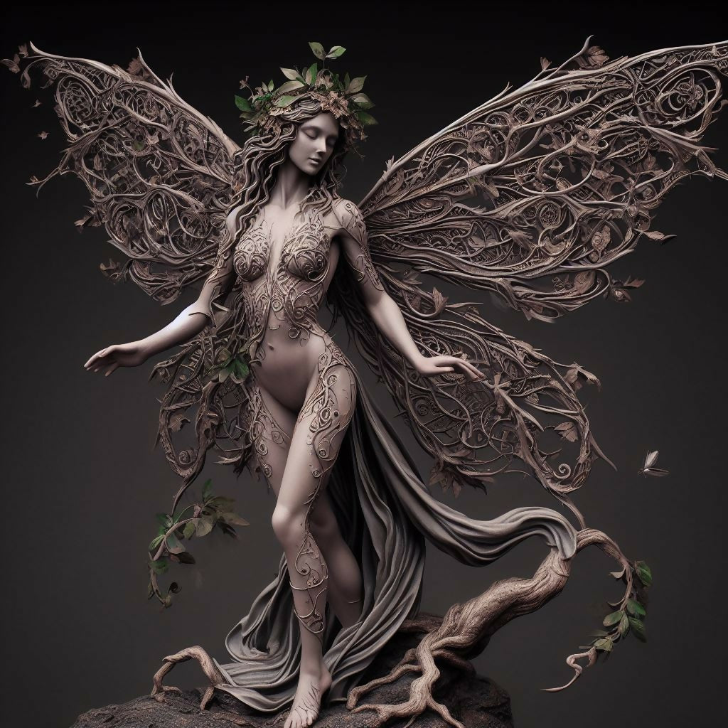 This Celtic fairy stands in quiet majesty as if guarding the secrets of an ancient forest. Her nude form, sculpted with graceful precision, evokes both vulnerability and strength. Large, ornate wings stretch behind her simbolizing freedom and mystery. The monochromatic gray palette enhances the mystical and timeless atmosphere. This piece blends Celtic spirituality with ethereal elegance, capturing a moment of silent enchantment in a forgotten grove.