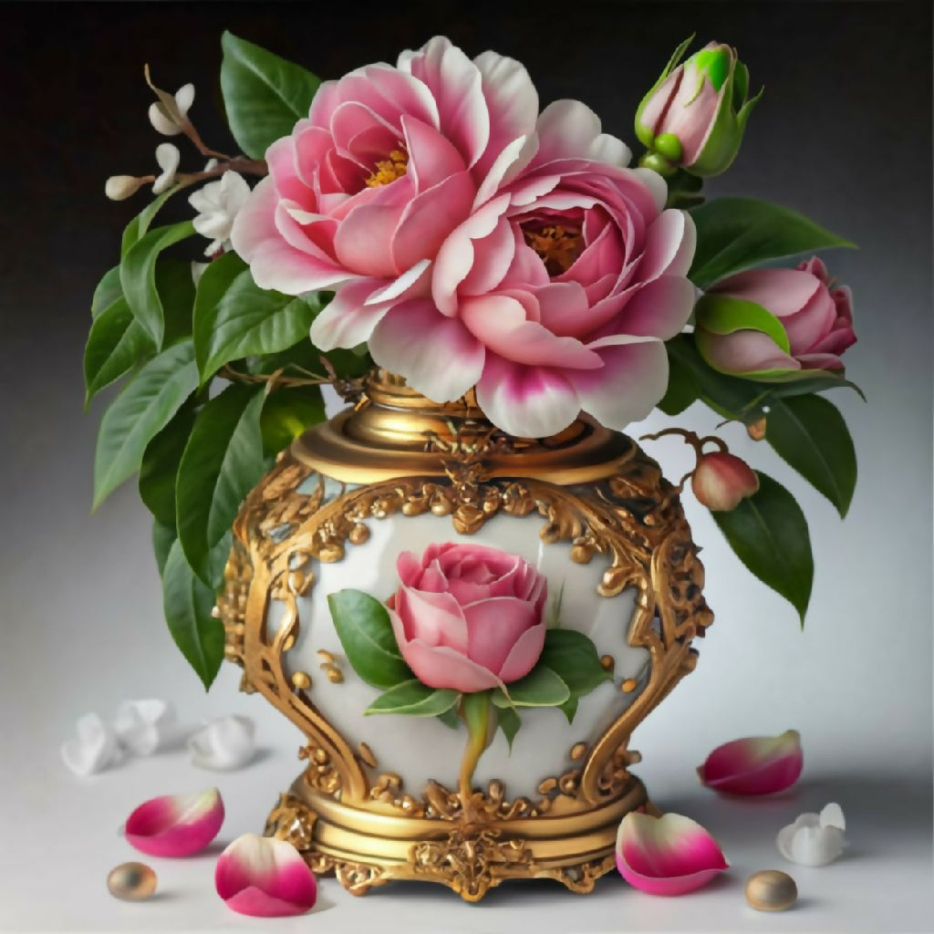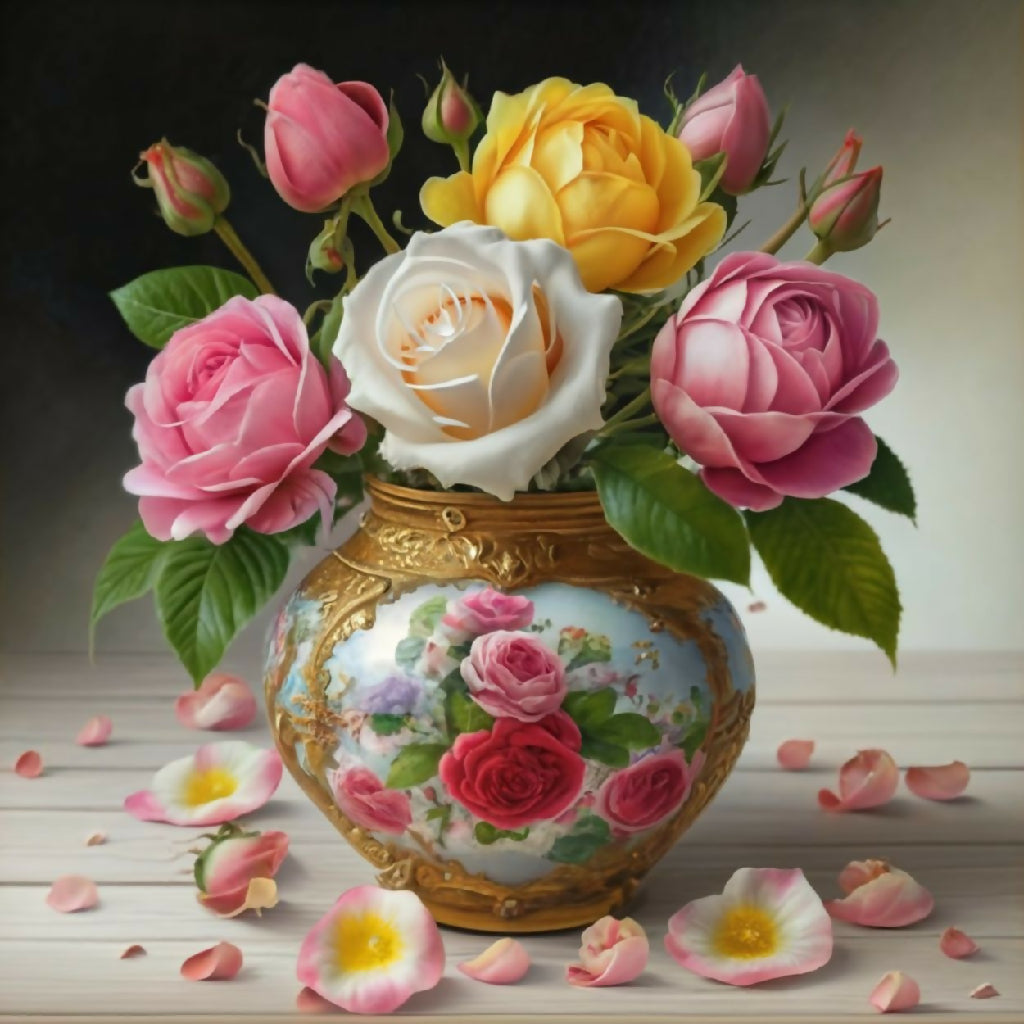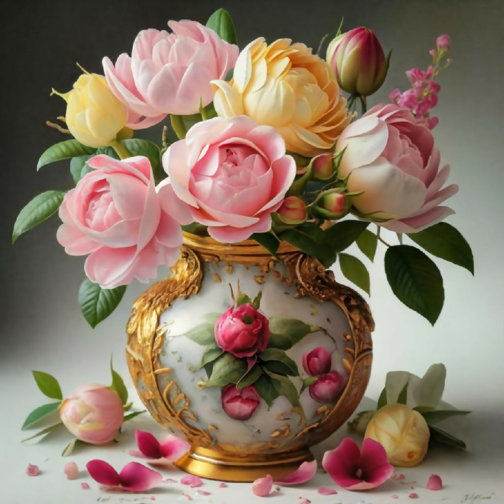 A luxurious bouquet of soft pink, white, and yellow roses arranged in an ornate, hand-painted porcelain vase with gold detailing. Scattered petals and lush green leaves enhance the romantic, vintage aesthetic. Perfect for still-life art, elegant decor, or floral design inspiration.