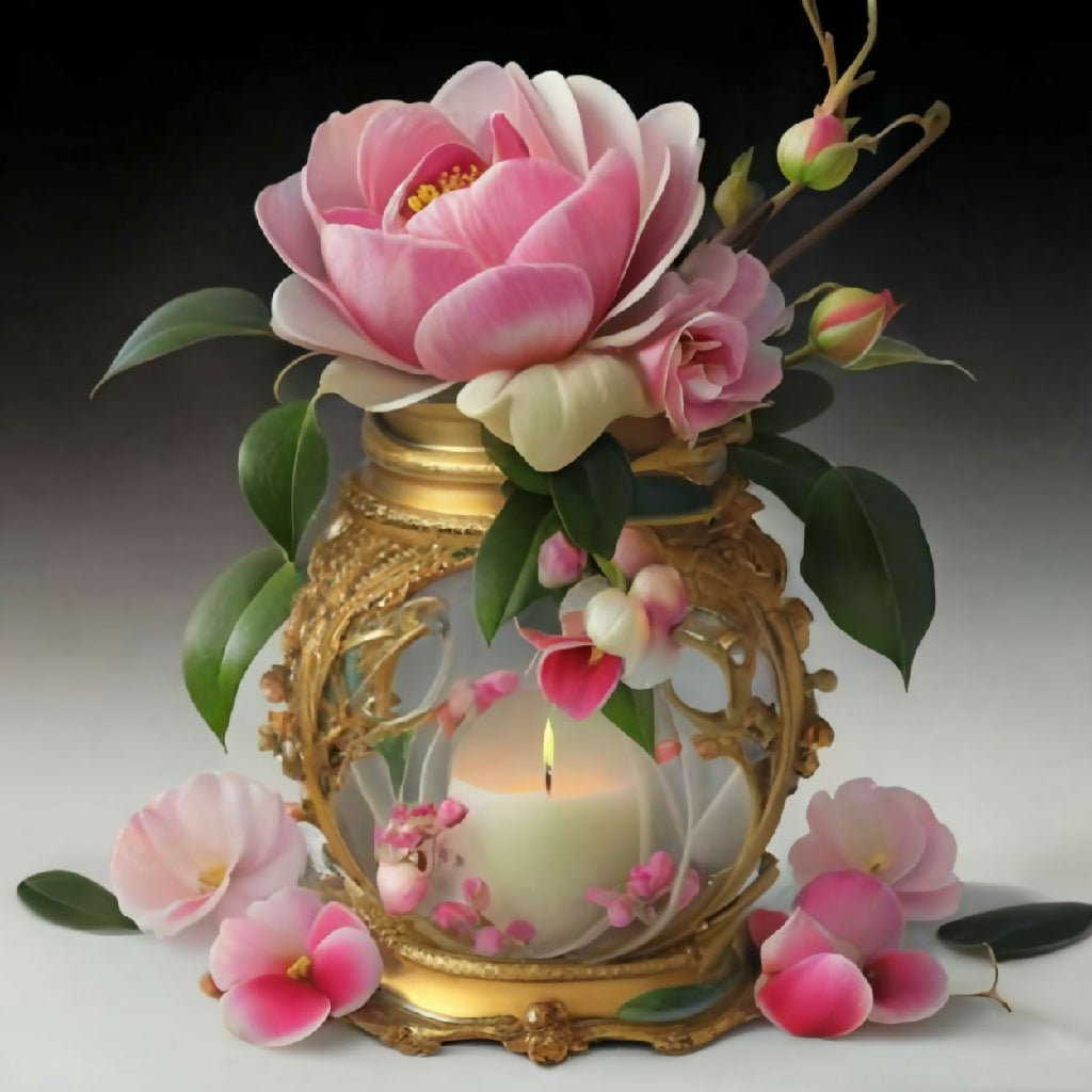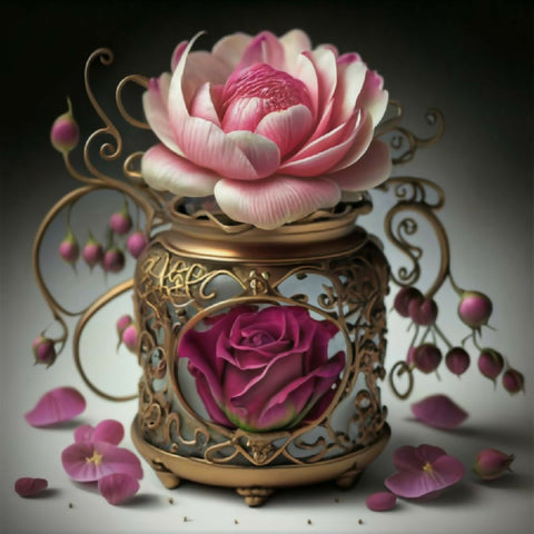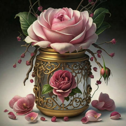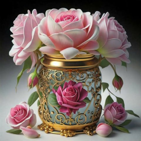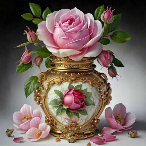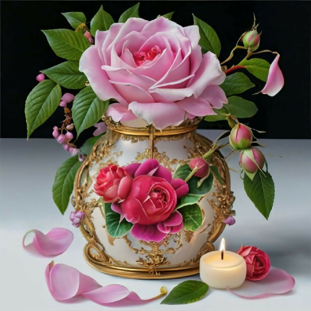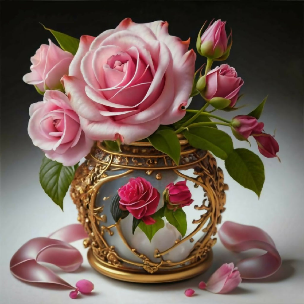 A luxurious bouquet of soft pink, white, and yellow roses arranged in an ornate, hand-painted porcelain vase with gold detailing. Scattered petals and lush green leaves enhance the romantic, vintage aesthetic. Perfect for still-life art, elegant decor, or floral design inspiration.