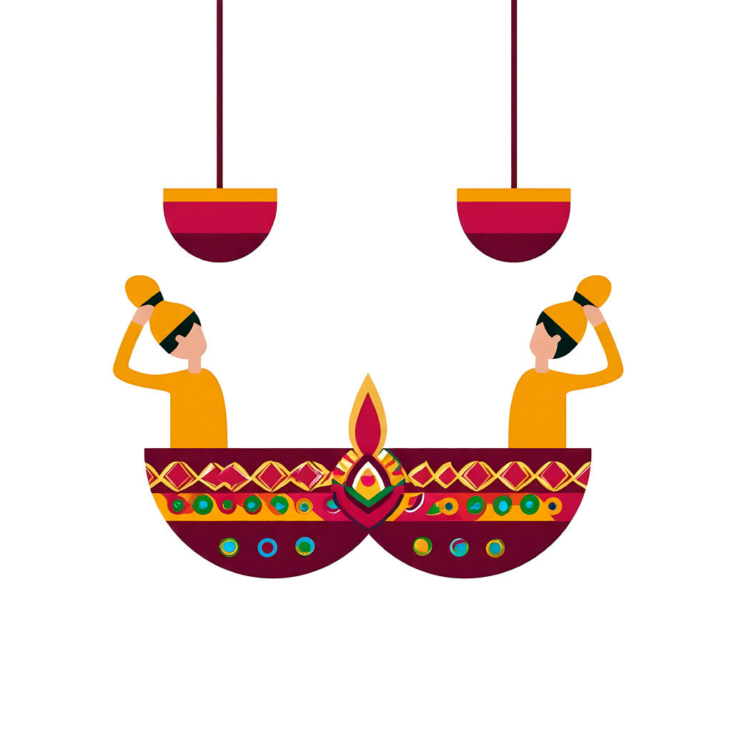Two flame-bearing guardians sit poised in ornate crescent-shaped boats, mirroring each other in a surreal ritual of balance and devotion. Dressed in ceremonial orange robes and crowned with vibrant headgear, they raise sacred orbs toward striped celestial domes above. The boats, adorned with tribal motifs and a central flame emblem, drift in a timeless void—symbolizing spiritual symmetry, cultural reverence, and the eternal dance of duality. This AI-generated artwork evokes a dreamlike ceremony from a forgotten civilization, blending myth and modern surrealism in a striking visual narrative.