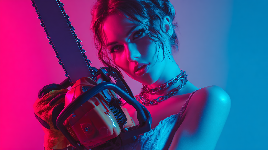 Tags: chainsaw, neon art, industrial, surreal, pink and blue, dramatic lighting, power, rebellion, futuristic, emotional tension, AI-generated, contemporary art, portrait, weaponized beauty