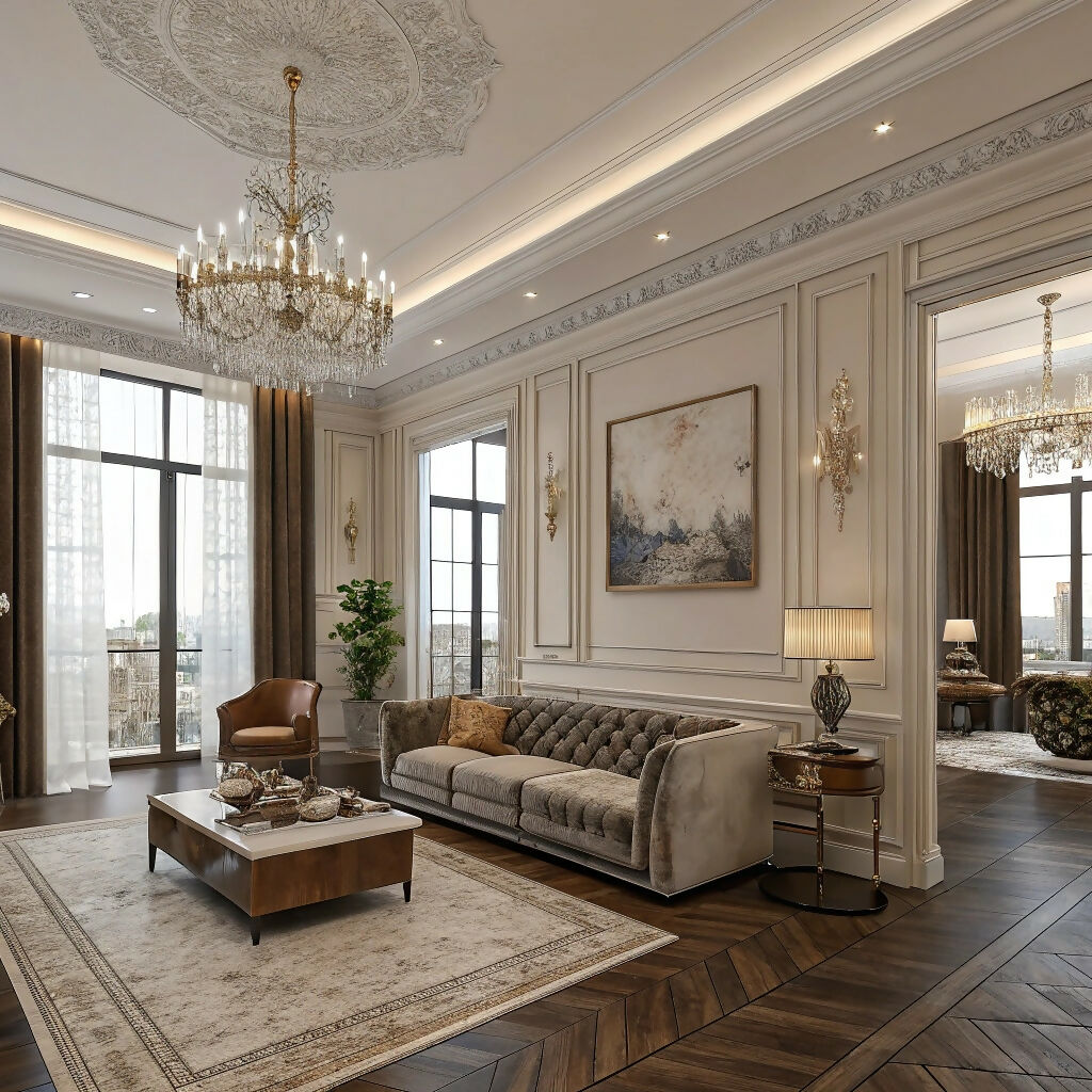A large, elegant living room is presented. The room features a high, ornate ceiling with a large crystal chandelier hanging from it.