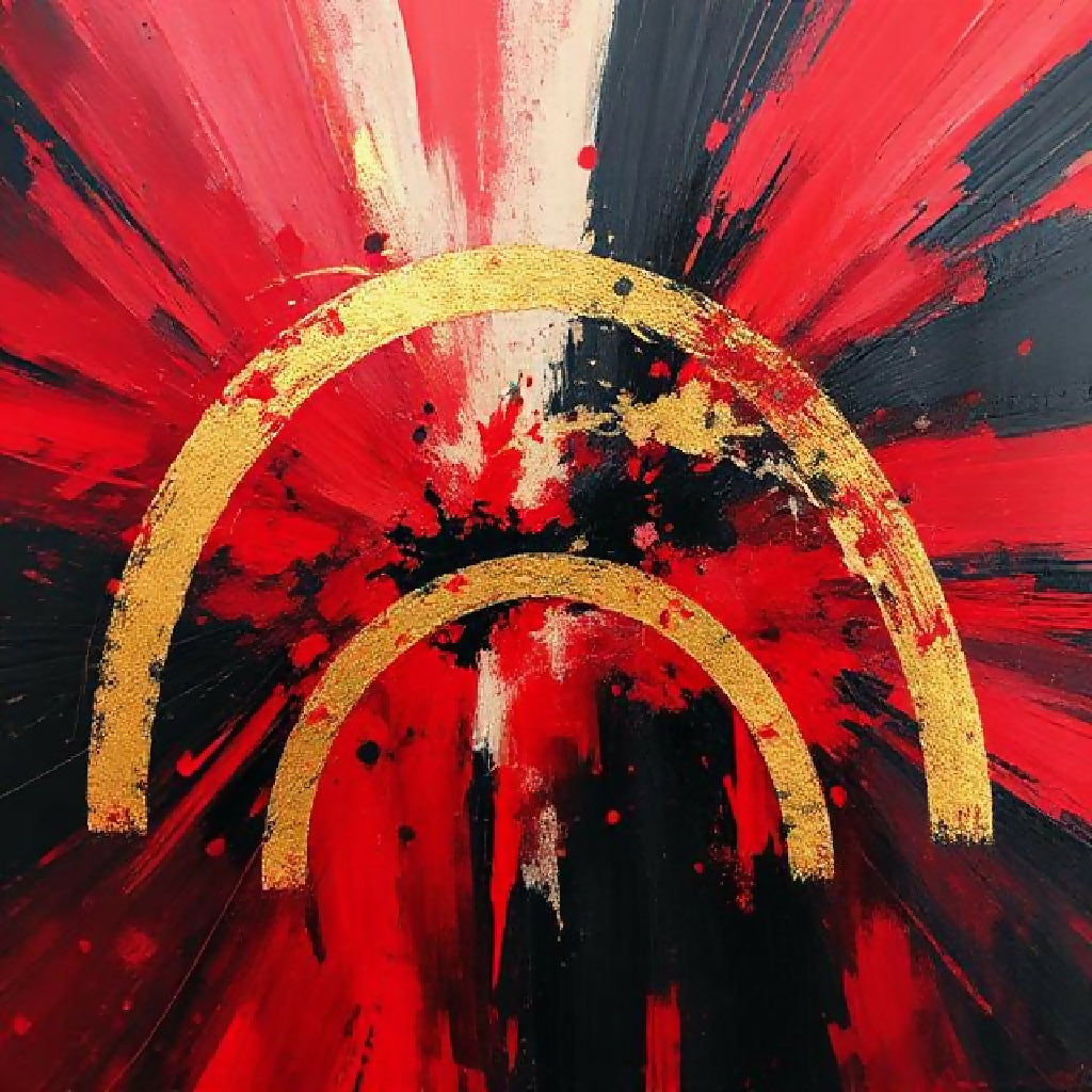 "An expressive painting of clashing red and black brushstrokes, overlaid with golden arcs, symbolizing the fragile balance between destruction and beauty."
