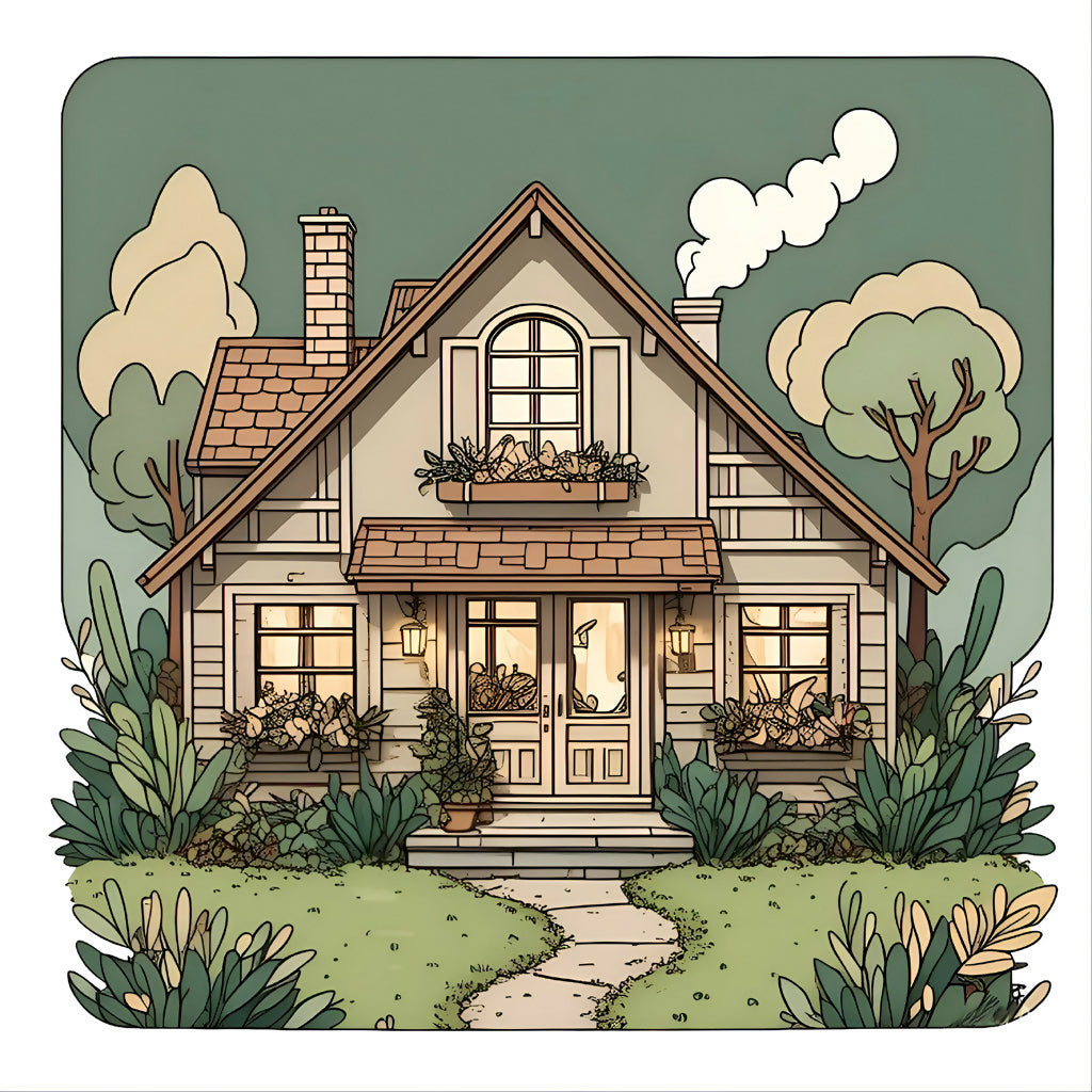 Experience the serenity of the countryside with this AI-generated art print, featuring a charming cottage nestled amidst lush greenery. The picturesque home, with its steep gable roof, brick chimney, and vibrant flower boxes adorning the windows, radiates warmth and tranquility. A stone pathway leads to the welcoming front door, surrounded by lush bushes and towering trees. The soft hues of the sky complement the peaceful setting, making this artwork a perfect addition to any space that embraces nature-inspired decor. Ideal for those who appreciate cozy retreats and scenic landscapes, this piece captures the beauty of rural life in exquisite detail.