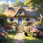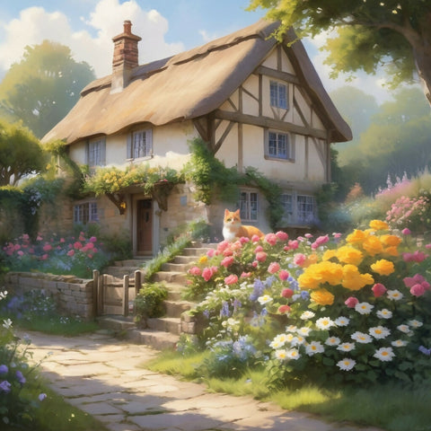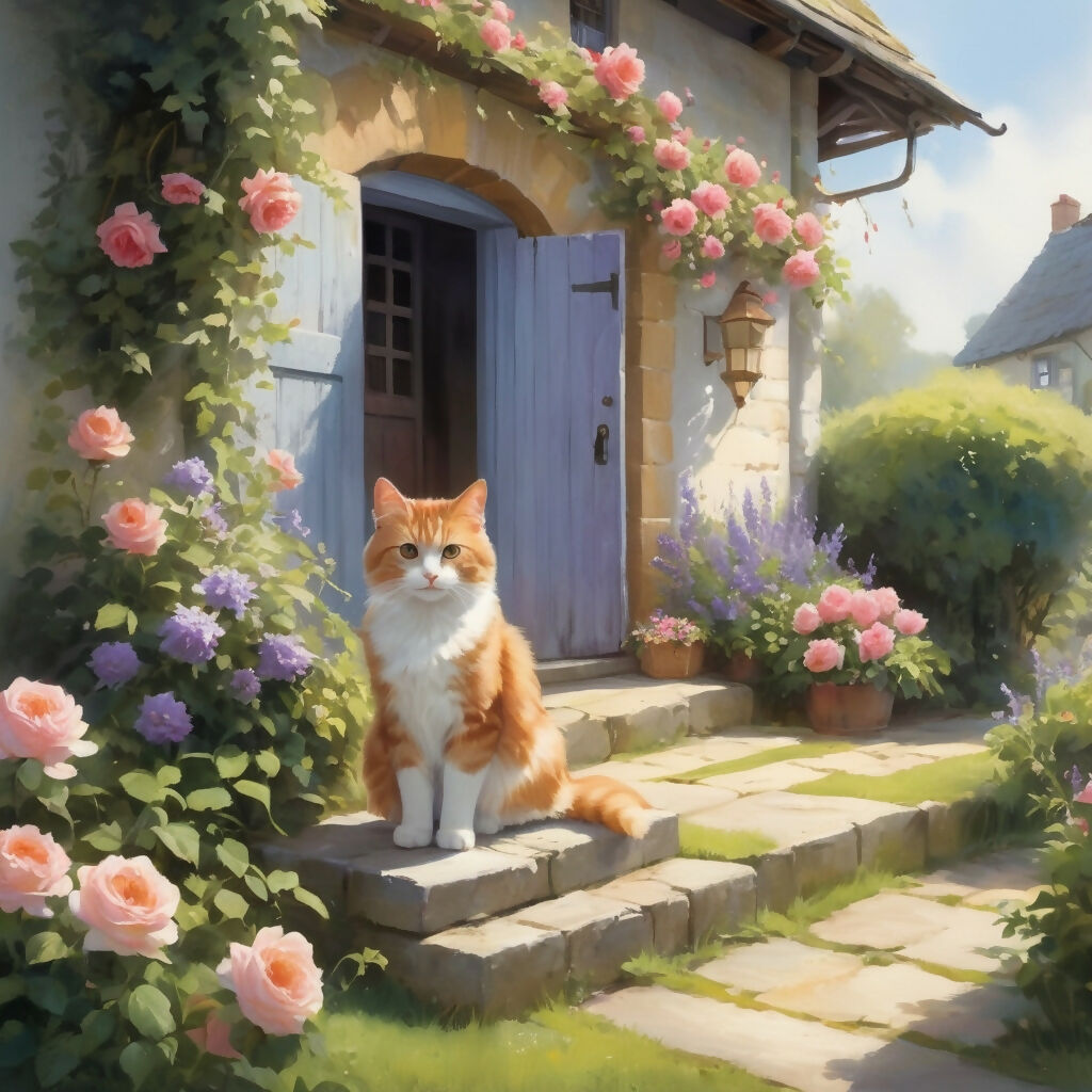 The background features a hazy blue sky with wispy clouds, blending seamlessly with gentle washes of cerulean and soft peach. Sunlight filters through the foliage, casting dappled light onto a stone pathway leading to the front door. A fluffy tabby cat lounges on a sun-warmed windowsill, its fur painted with delicate shades of gray and beige, blending softly with the cozy scene. The use of wet-on-wet techniques enhances the dreamlike softness, while fine details in the flowers and architecture add depth, making this watercolor painting a peaceful and inviting countryside escape.