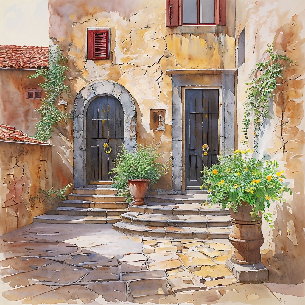 Charming Italian Doors Watercolor: Tuscan Architecture Digital Art Print