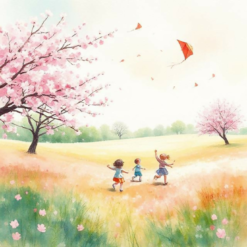 A gentle watercolor-style artwork of children running freely across a meadow, their laughter carried by the breeze as colorful kites dance in the sky. Blossoming cherry trees frame the scene in soft pink petals, symbolizing joy, innocence, and the fleeting beauty of childhood. This piece captures the pure delight of simple moments under the warmth of spring.
