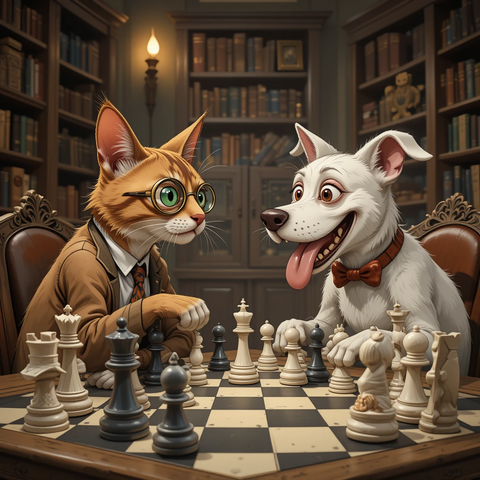 A serious chess game between a smart cat wearing a monocle and a silly dog with its tongue joyfully protruding is shown in this incredibly realistic and funny artwork. With fish-shaped pieces for the cat and bone-shaped pieces for the dog, the chessboard's distinctive design gives the game a comical touch. The scenario, which is set in a comfortable study space with warm lighting, bookcases, and tasteful décor, strikes a balance between humour and artistic expression to provide a sweet and whimsical story. This painting is a charming addition to any area and is ideal for aficionados of whimsical, intricate art as well as animal enthusiasts.