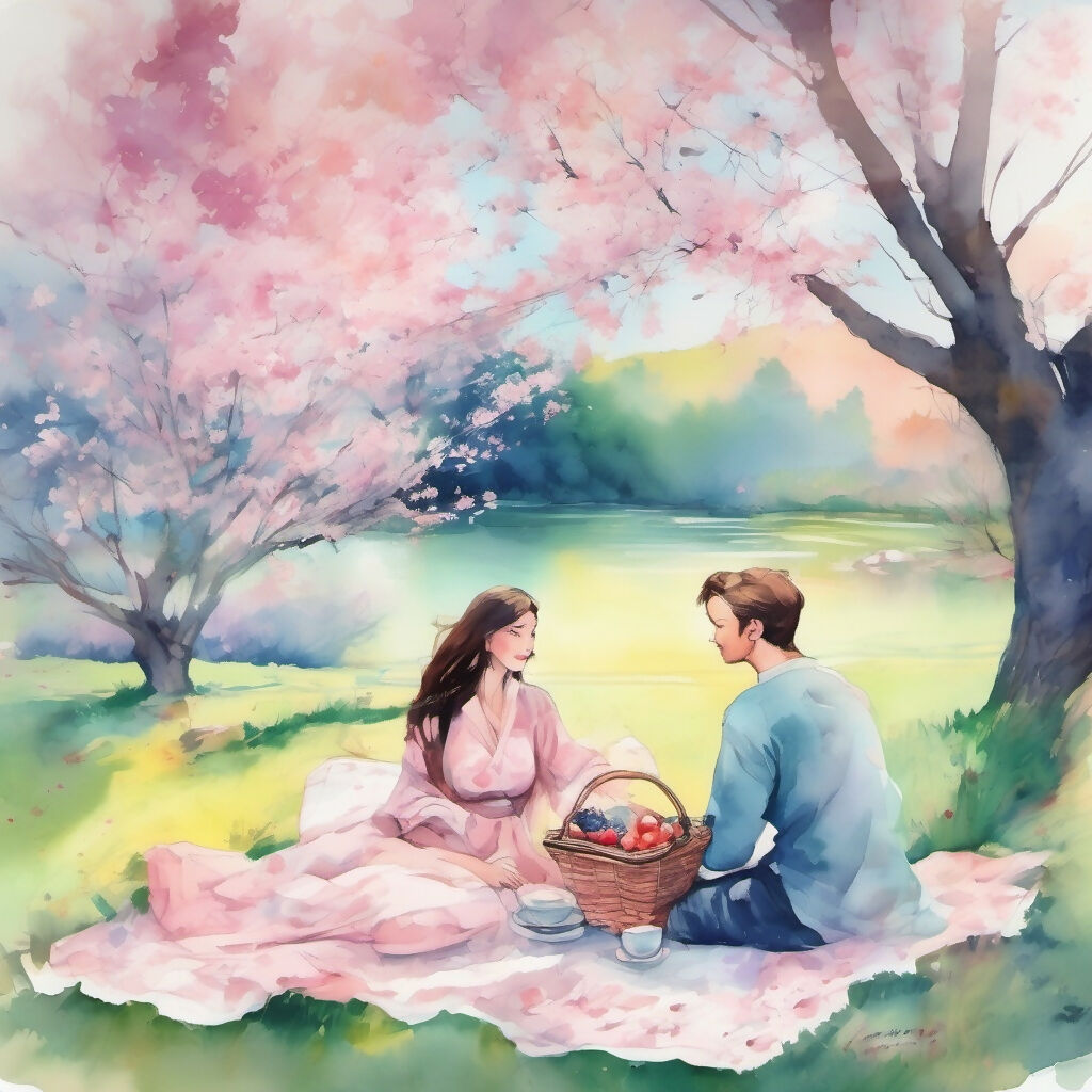"A romantic watercolor painting of a young couple sitting beneath a canopy of cherry blossoms, enjoying a peaceful picnic as delicate pink petals drift gently around them. The scene is bathed in soft, warm sunlight filtering through the branches, casting a golden glow on the couple and the lush green grass beneath them.