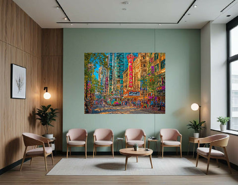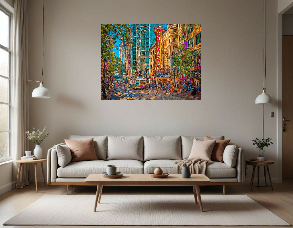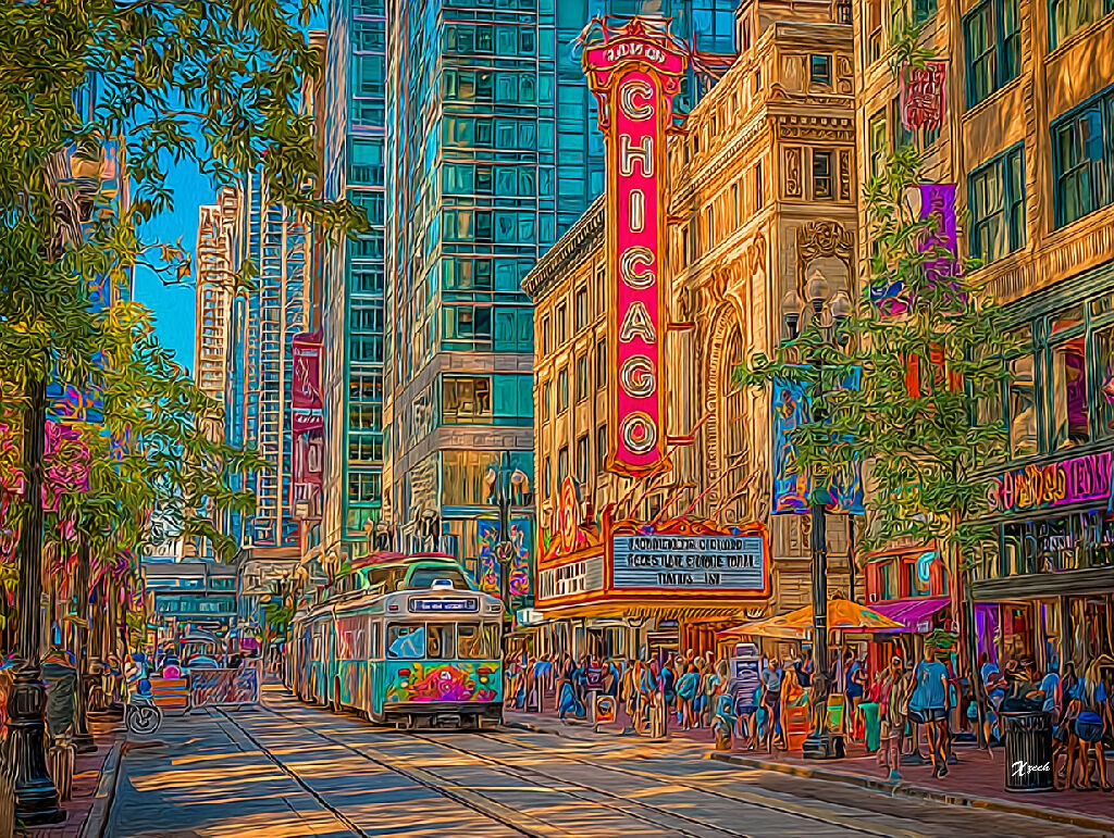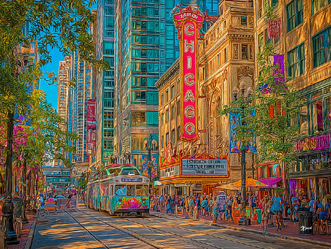 This vibrant painting captures a bustling street scene in Chicago, dominated by the iconic Chicago Theatre. The artwork employs a high-contrast, painterly style with bold outlines and saturated colors, giving it a dynamic and lively feel.