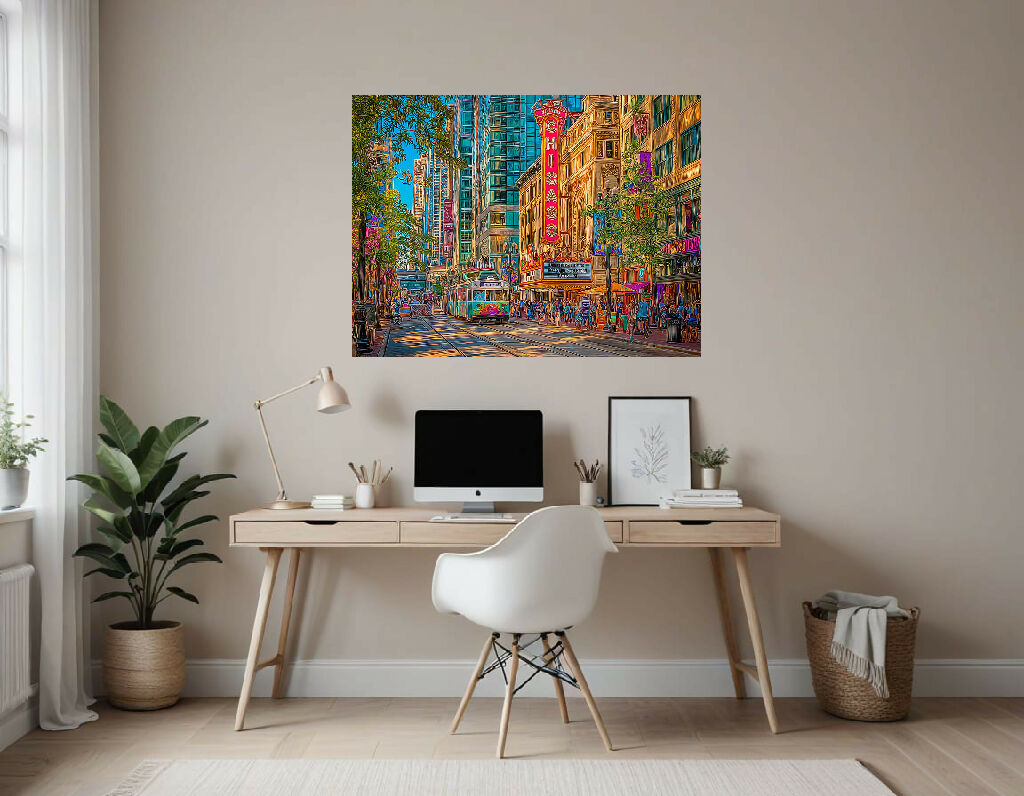 A trolley car decorated with colorful designs is prominently featured on the left side of the painting, adding movement and visual interest. Trees with lush green foliage frame the scene, contributing to the urban landscape. The sunlight casts long shadows across the street, enhancing the depth and dimension of the composition.