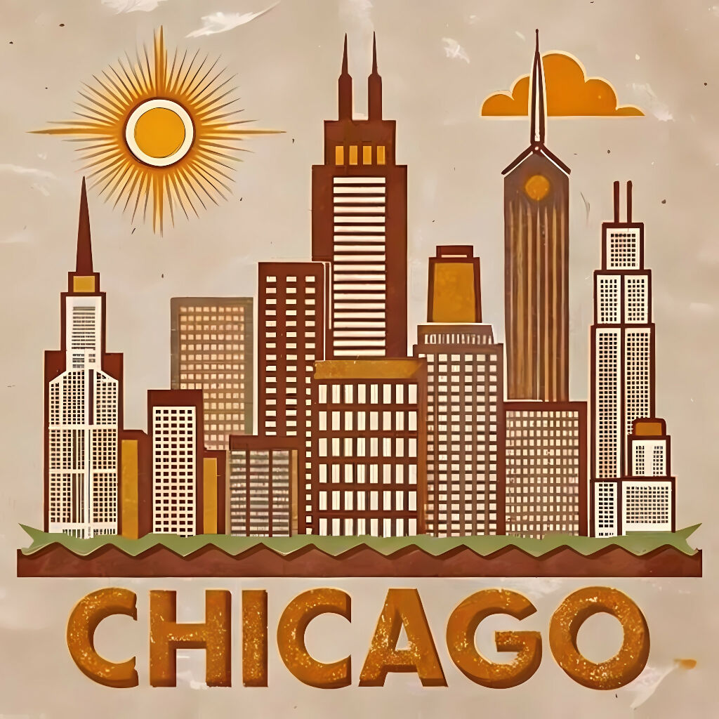 A vintage-style poster depicting the Chicago skyline. The image features a collection of tall buildings in various shades of brown and yellow, with a prominent skyscraper in the center. The buildings are set against a light beige background with a subtle texture, giving the poster a retro feel.