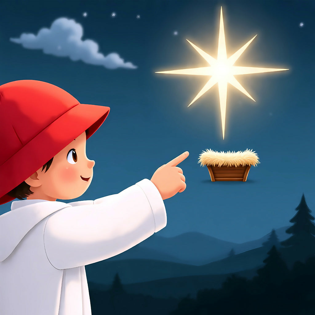 This touching artwork captures the innocence and awe of a child gazing at the radiant Star of Bethlehem. Dressed warmly in a red hat and white coat, the child points toward the glowing star that shines above a humble wooden manger filled with hay. The dark blue sky, dotted with clouds and stars, frames the scene while silhouettes of pine trees and hills complete the tranquil setting. This piece tells a timeless story of faith, guidance, and the miracle of Christmas—reminding us of the wonder that the Star of Bethlehem continues to inspire across generations.