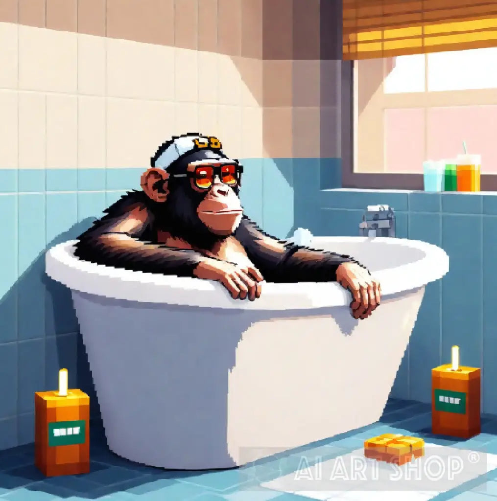 A chimpanzee is taking a bath in a bathtub