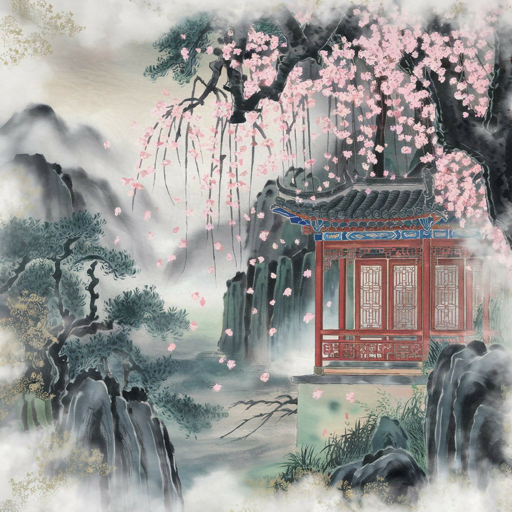 - Features serene mountains, flowing rivers, cherry blossoms.