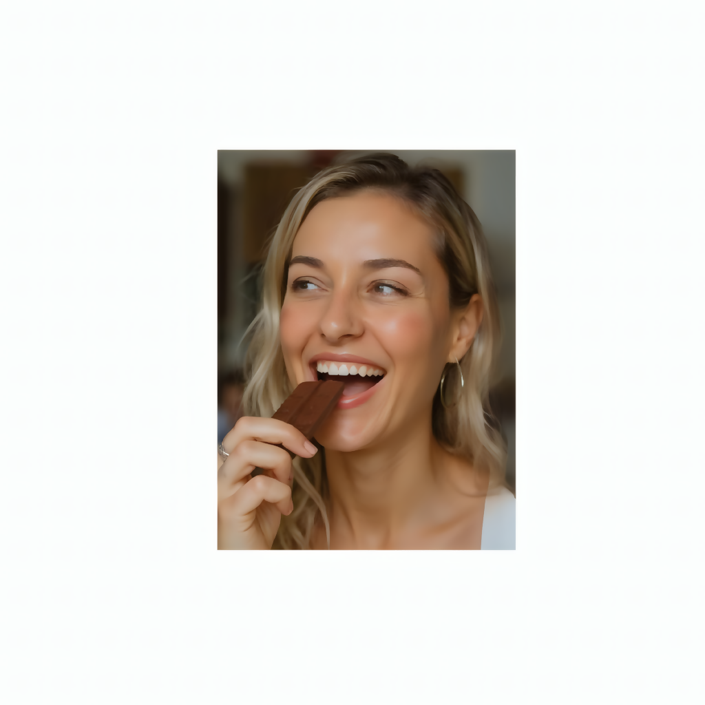 A hyper-realistic, sharp-focused portrait of a middle-aged woman with smooth glowing skin, taking a bite of chocolate. The cinematic ambiance and natural facial symmetry captured in 8K HDR make this a stunning digital artwork shot on iPhone Pro Max.