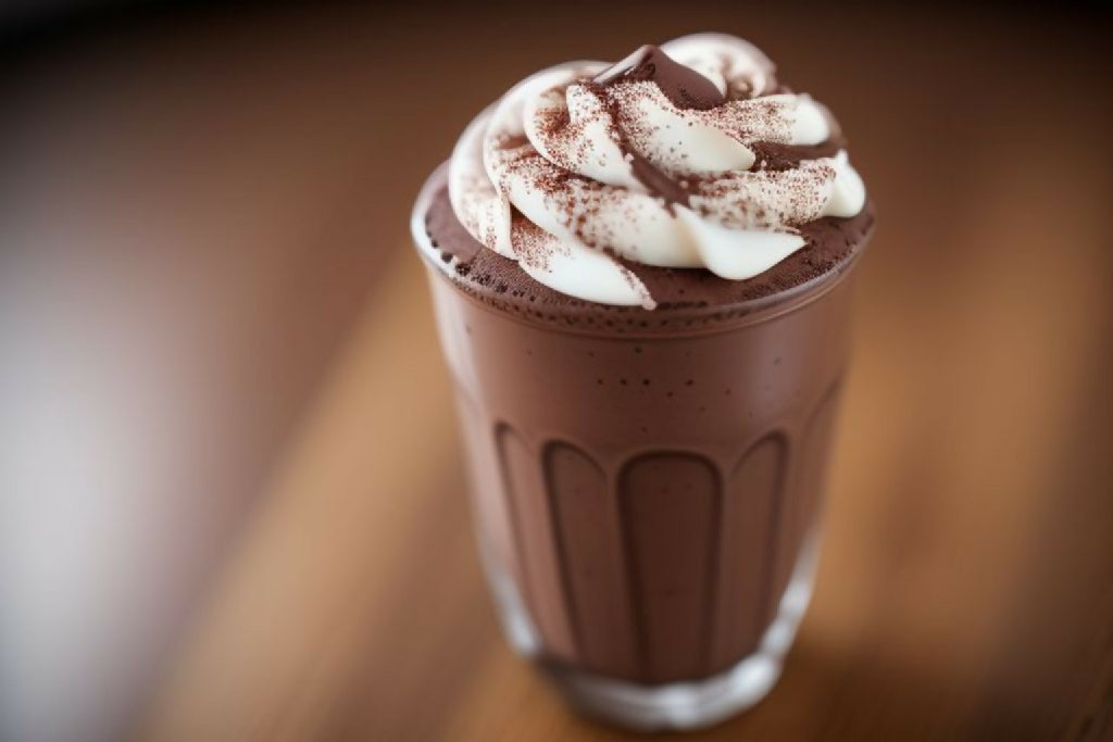 A yummy chocolate milkshake is placed on a wooden table. It looks great to drink during hot weather.