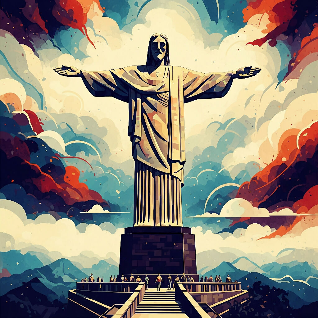 This vibrant and stylized illustration depicts the iconic Christ the Redeemer statue in Rio de Janeiro, Brazil. The statue stands majestically atop Corcovado mountain, with its arms outstretched in a welcoming embrace. The background is filled with dramatic, swirling clouds in shades of blue, orange, and red, creating a dynamic and almost ethereal atmosphere. Below the statue, a viewing platform is visible, populated by a number of people, emphasizing the grandeur and scale of the monument. The overall artistic style uses bold colors and distinct outlines, giving it a modern, almost graphic novel-like aesthetic.