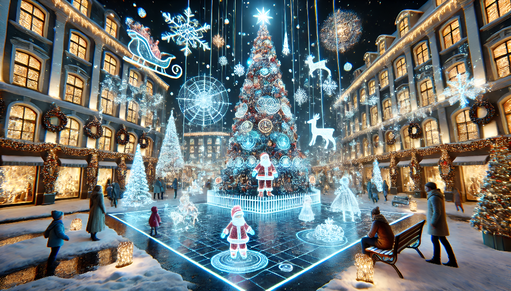 3D holographic Christmas scene combining traditional elements with a futuristic holographic touch.