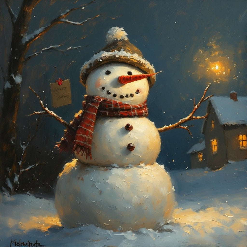 This christmas painting depicts a friendly snowman standing proudly in a serene, snowy landscape under a   nighttime sky. The snowman is adorned with a cozy knitted hat, a vibrant red plaid scarf, a carrot nose, and coal eyes and mouth, exuding a warm and inviting presence.