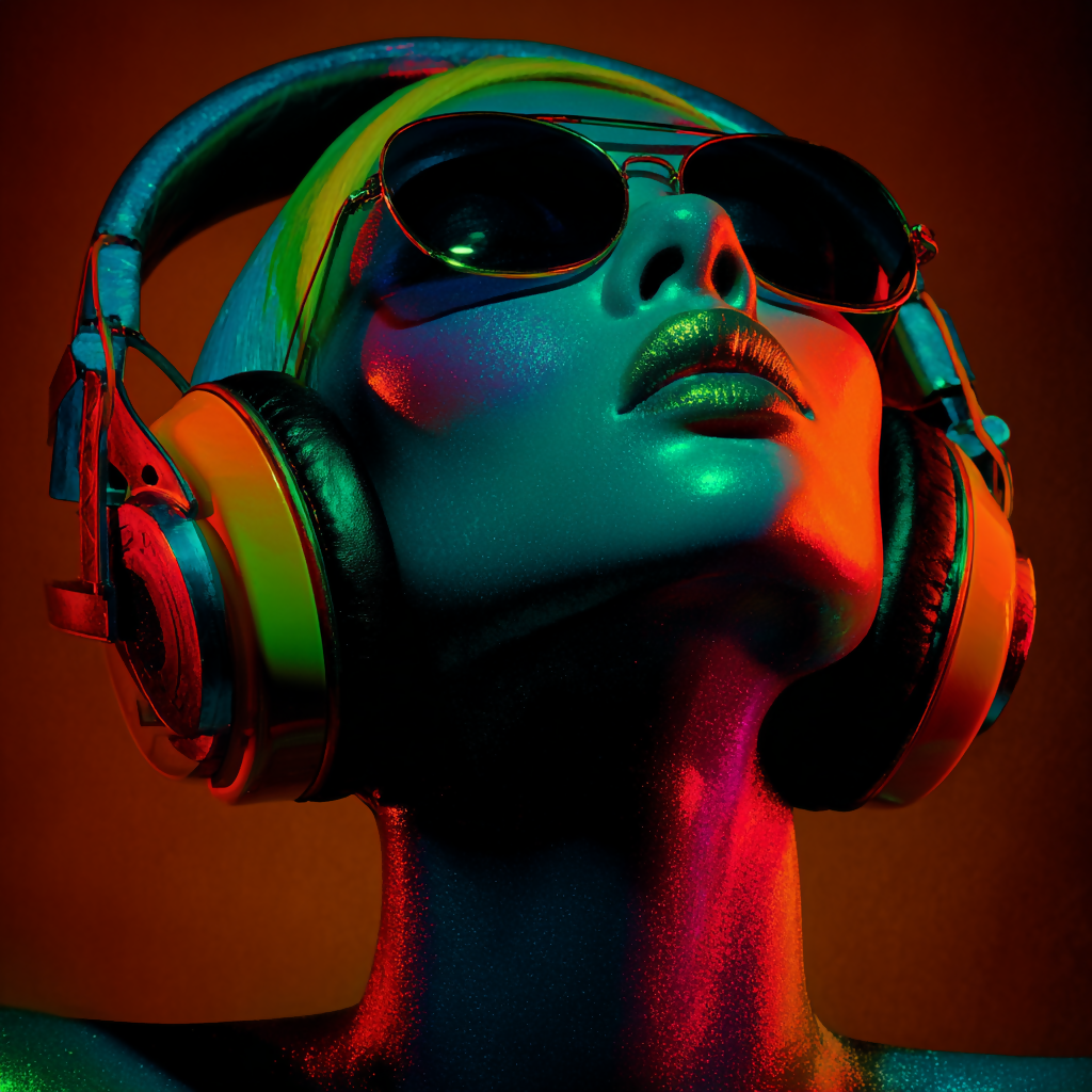 Tags: Headphones, Metallic Finish, Iridescent Colors, Gradient Background, Music Portrait, Vivid Contrast, Futuristic Style