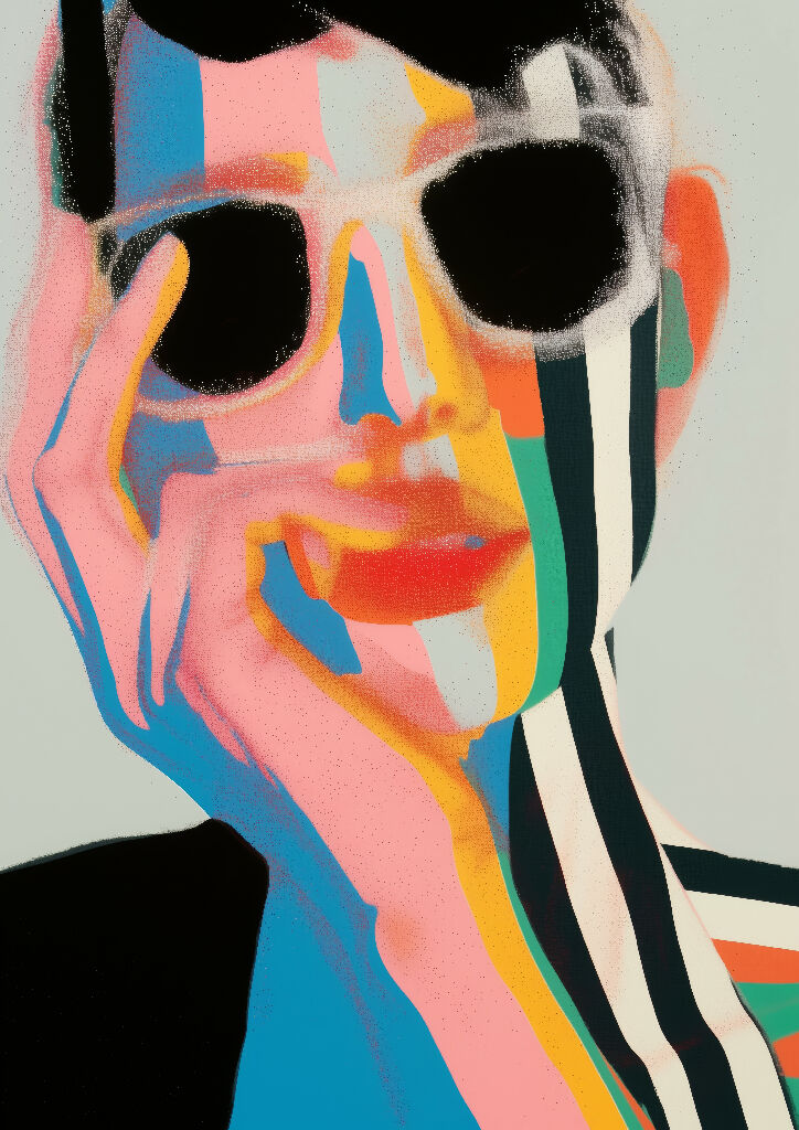 Keywords: abstract portrait, AI art, colorful face illustration, modern wall decor, digital portrait, vibrant art print, fashion art, expressive design.