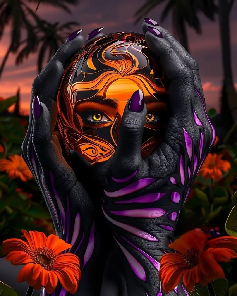 The image depicts a close-up of a person's face, with his eyes and mouth obscured by bold, vibrant patterns and swirls of orange, yellow and purple colors. Creating a stunning, almost surreal visual effect. The subject's head is framed by a background of lush tropical foliage, with large, vibrant orange flowers in the foreground, adding to the mystical, dream-like atmosphere of the image. The overall composition and striking use of colors and patterns create a sense of mystery and intrigue, inviting the viewer to consider the meaning and symbolism behind this visually compelling image. A suitable name for this image could be “Tropical Masquerade” or “Chromatic Illusion”, as it captures the mix of natural and surreal elements within the frame.