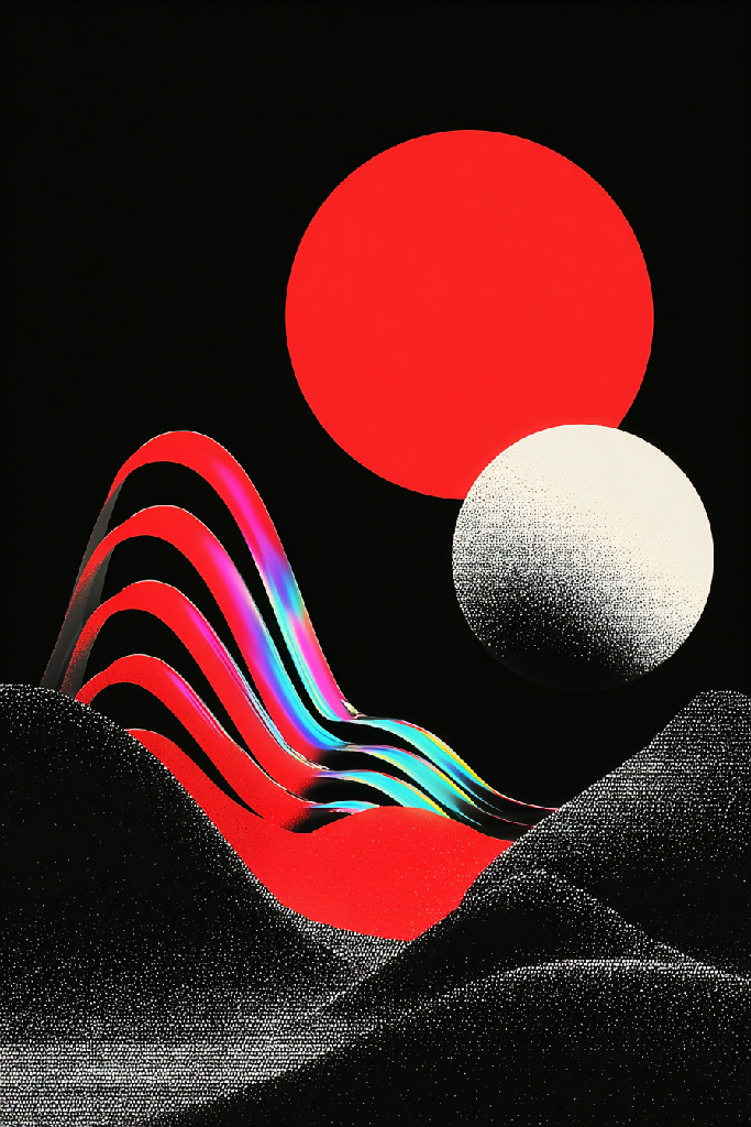 Tags: abstract, digital art, surreal, gradient, red, black background, iridescent, minimal, modern, wavy shapes, futuristic, visual art, chromatic, geometric