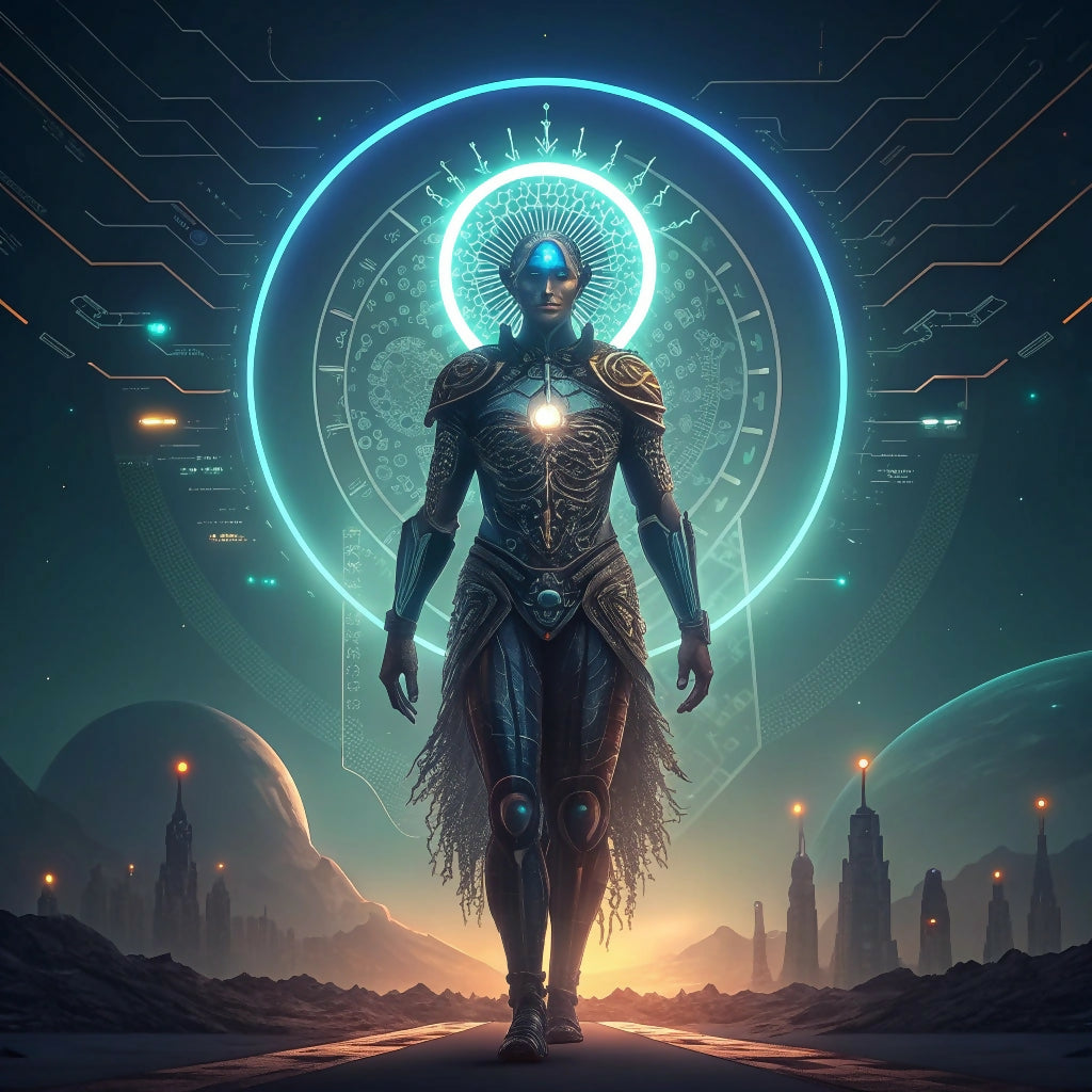 Surrounding the figure is a vibrant, glowing turquoise-blue halo-like circle, reminiscent of a digital aura or energy field.  The circle contains intricate symbols and patterns, reminiscent of ancient or futuristic script.