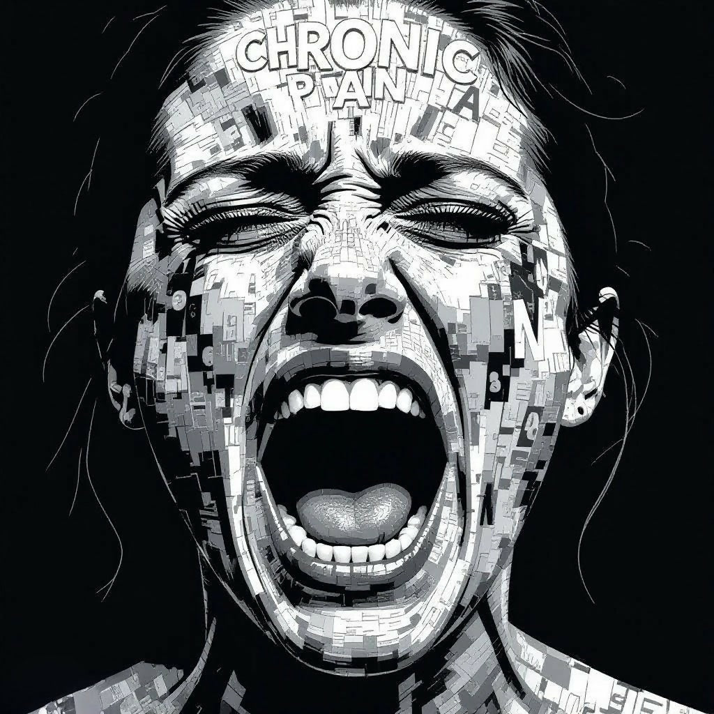 A striking artwork depicting a face in distress, composed of fragmented text and images, symbolizing the overwhelming nature of chronic pain.