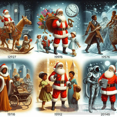 The canvas comes alive with vignettes capturing distinct periods in history, each showcasing Santa's presence amid unique holiday traditions. Witness medieval festivities with Santa donning robes of old, distributing gifts amidst ancient castles and candlelit celebrations. Traverse through Renaissance landscapes where art and culture flourish, and Santa spreads cheer amidst grand feasts and revelry.