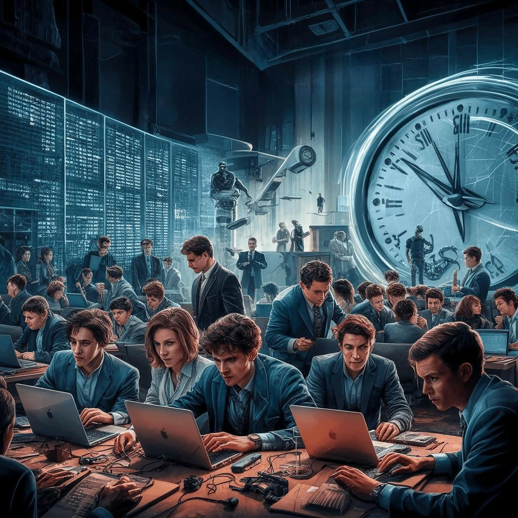 Step into the bustling world of "Chronos Workspace," a mesmerizing digital art piece that beautifully captures the high-energy environment of a futuristic office. In this vibrant scene, employees are deeply engrossed in their work, illuminated by the soft glow of their laptops. The backdrop features an enormous, intricate clock symbolizing the relentless passage of time and the ever-present pressure of deadlines. This artwork seamlessly blends elements of technology and human endeavor, offering a thought-provoking glimpse into the future of workspaces.