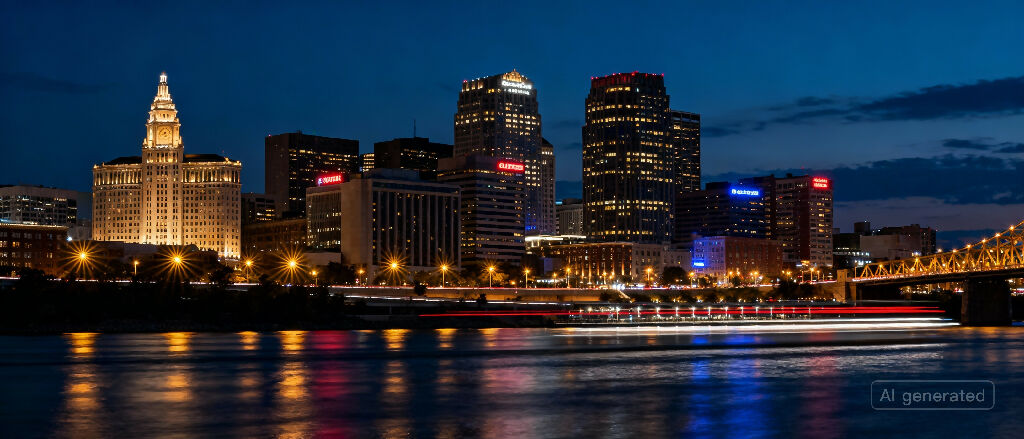 The stunning nighttime view of the Cincinnati skyline reflected on the calm waters of the Ohio River. The scene features a mix of modern skyscrapers and historic buildings glowing brightly against a deep blue evening sky. The iconic Roebling Suspension Bridge, illuminated in golden light, stretches across the right side of the image, adding a touch of elegance to the cityscape. The reflections of the city lights shimmer beautifully on the river’s surface, while long-exposure effects create smooth motion in the water and streaks of light from passing boats, giving the photo a vibrant yet serene Cincinnati city atmosphere.