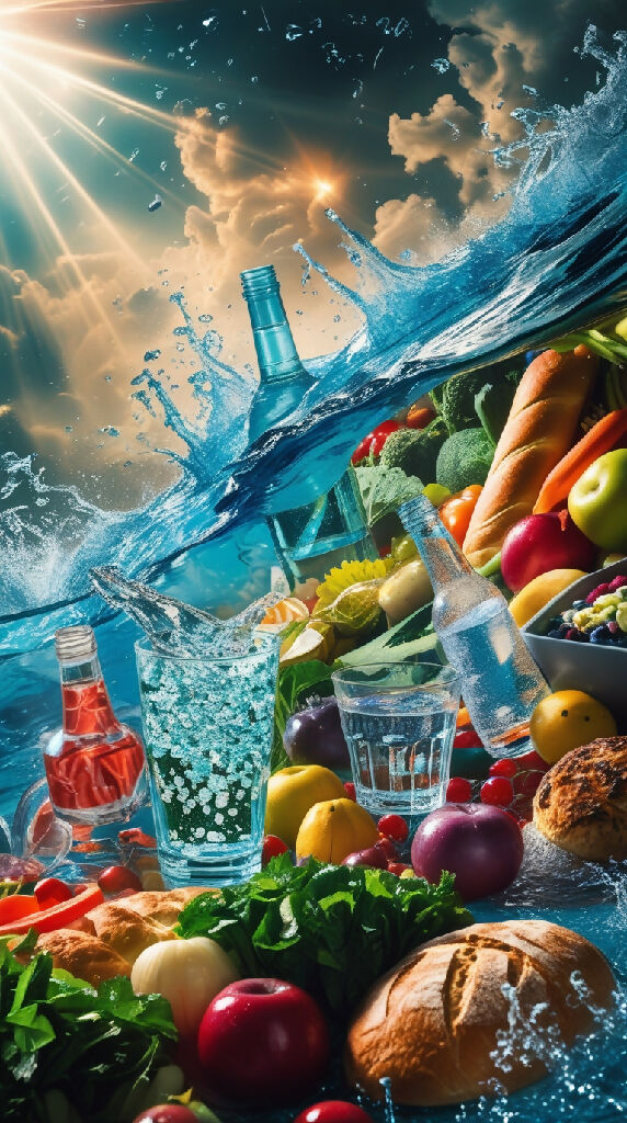 Cinematic epic artwork, vibrant and colorful, dramatic and intense, representing "Water" as the main theme. A powerful fusion of fresh food elements (fruits, vegetables, bread, feast) and water as drinks in different variations (crystal clear glasses of water, bottles, sparkling water with bubbles, flowing water in cups, icy water in goblets), surrounded by dynamic water elements (splashes, waterfalls, waves). Background filled with epic cinematic details – glowing skies, radiant light beams, dramatic atmosphere, surreal haze. Ultra realistic, 8k, hyper-detailed, vibrant masterpiece, attention-grabbing, wild and powerful.