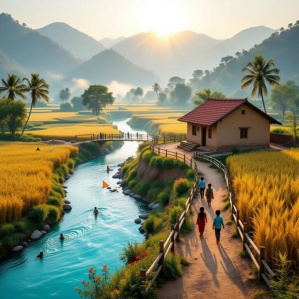 This artwork showcases a grand cinematic panorama of a peaceful Indian village. A charming mud house sits on a small green hill overlooking a crystal-clear river, surrounded by golden wheat fields and tall coconut trees. A hanging wooden bridge crosses the river while distant misty hills create depth and atmosphere. Villagers carrying pots, children flying kites, and cows at the riverbank bring authenticity and warmth. Designed in a watercolor + oil mural blend with rich lighting and soft textures, this wallpaper
