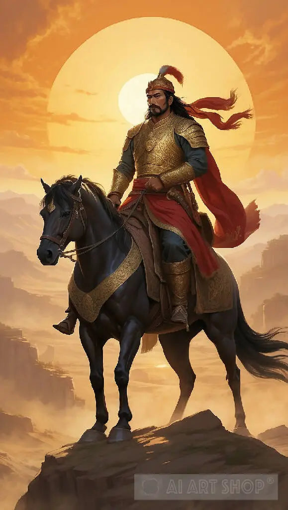 Cingiz Khan, mounted on a majestic stallion, surveying the battlefield from a high vantage point, his presence commanding and fierce, with the sun setting behind him, casting a golden glow."