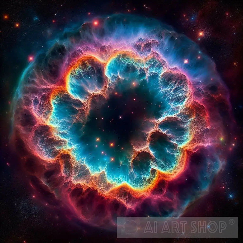 The Crab Nebula, officially cataloged as Messier 1 (M1), is a stunningly intricate remnant of a supernova explosion observed by Chinese astronomers in 1054 AD. Located in the constellation Taurus, approximately 6,500 light-years away from Earth, this celestial masterpiece spans about 11 light-years in diameter. Its distinctive circular shape, as depicted in the artwork, is characteristic of a fisheye view, offering a mesmerizing perspective of its intricate filaments and expanding shock waves.