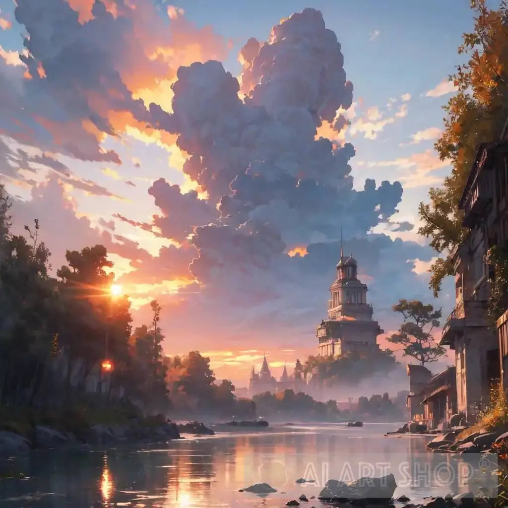 An AI-generated artwork that shows a European-style city along with nature under dusk.