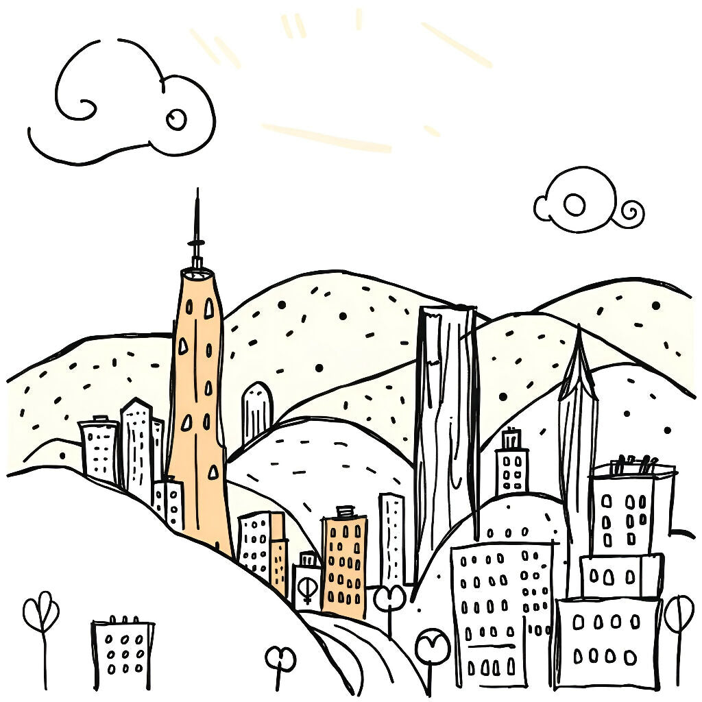 o    Hand-drawn, comic-style cityscape nestled in dotted hills