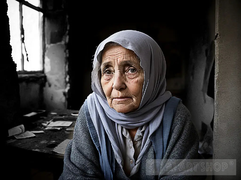 A photograph of an elderly woman sitting in her war-damaged home, unable to cry since her eyes are filled with grief.