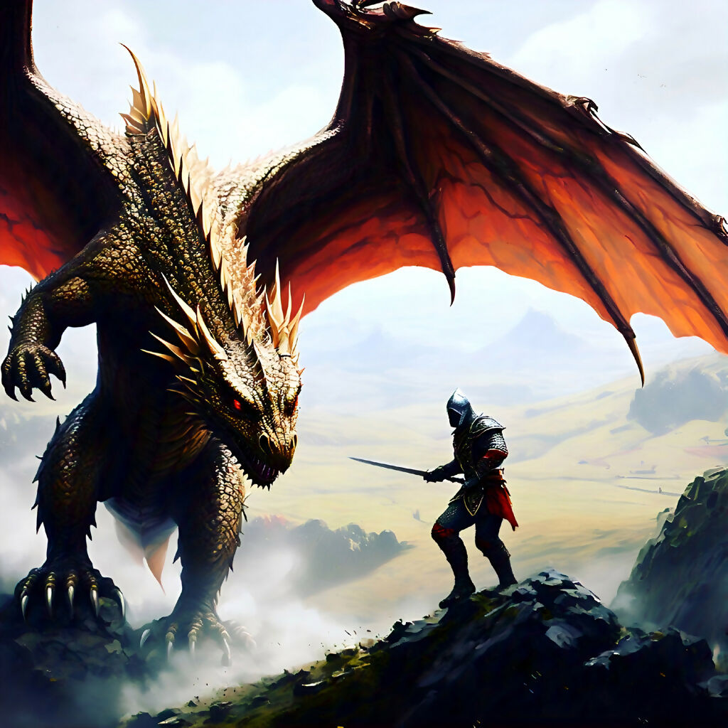 A lone knight stands defiant atop a jagged cliff, facing a colossal golden dragon whose wings blot out the stormy sky. Clash at Dragonspire captures the moment before battle—where courage meets chaos, and legends are born. This AI-generated artwork blends cinematic fantasy with sweeping natural vistas, evoking the timeless struggle between light and darkness. Inspired by mythic tales and heroic quests, it’s perfect for collectors who crave drama, depth, and storytelling in their wall art. Ideal for fantasy lovers, gamers, and epic art enthusiasts.