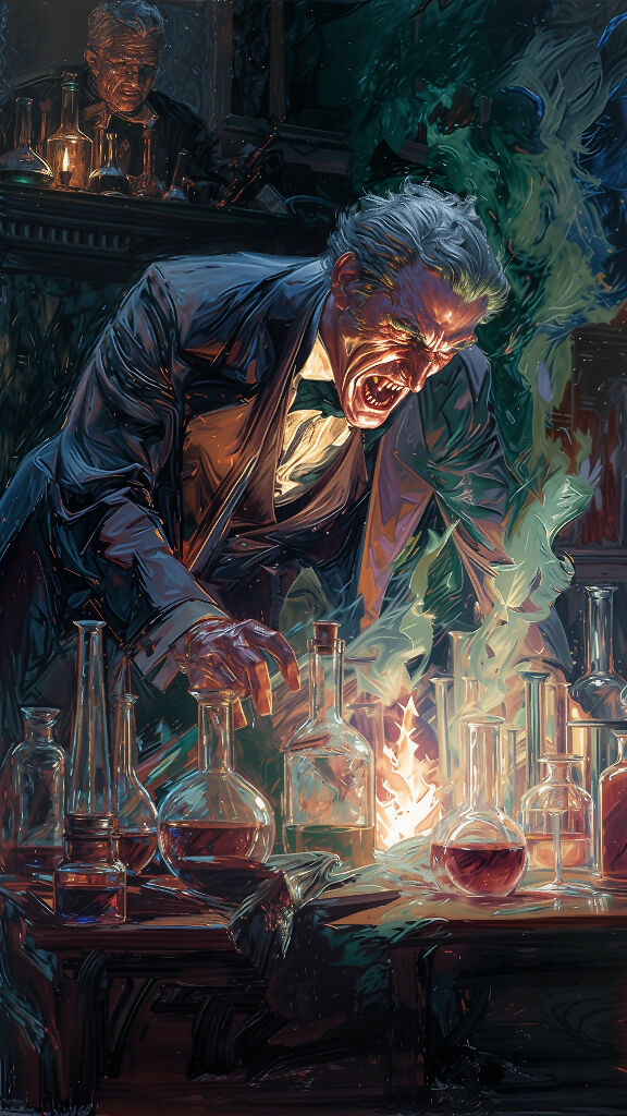 In a shadowed Victorian study filled with flickering candlelight, glass vials shatter and green chemical mist swirls around him. One half of his face remains human — refined, terrified — while the other twists into a grotesque, primal snarl, veins dark and eyes blazing red.