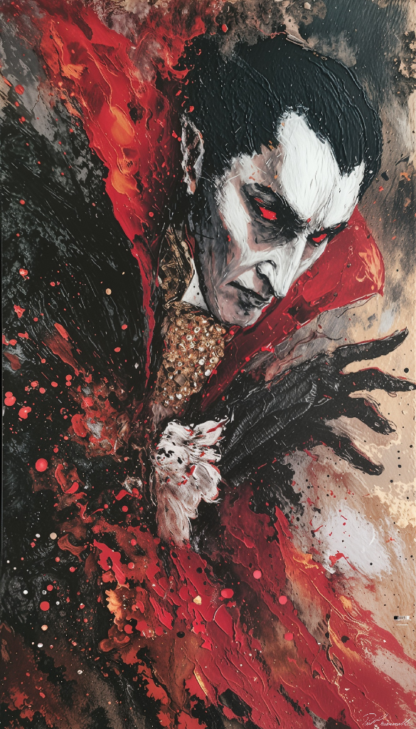 Painted in rich, expressive oil strokes — dramatic lighting, chiaroscuro contrast, and a palette of deep reds, blacks, and ghostly whites to evoke both elegance and dread — capturing Dracula in his most monstrous and regal form.