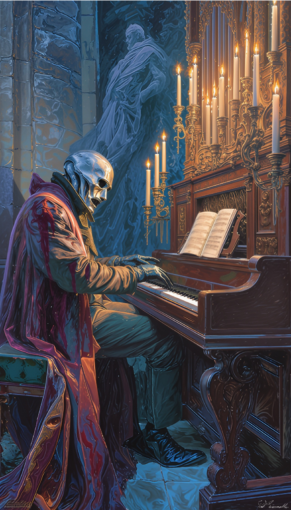 His gloved hands hover over the organ keys as a crimson cloak flows behind him like living flame. In the background, the ghostly silhouette of his lost love appears in soft, ethereal light.